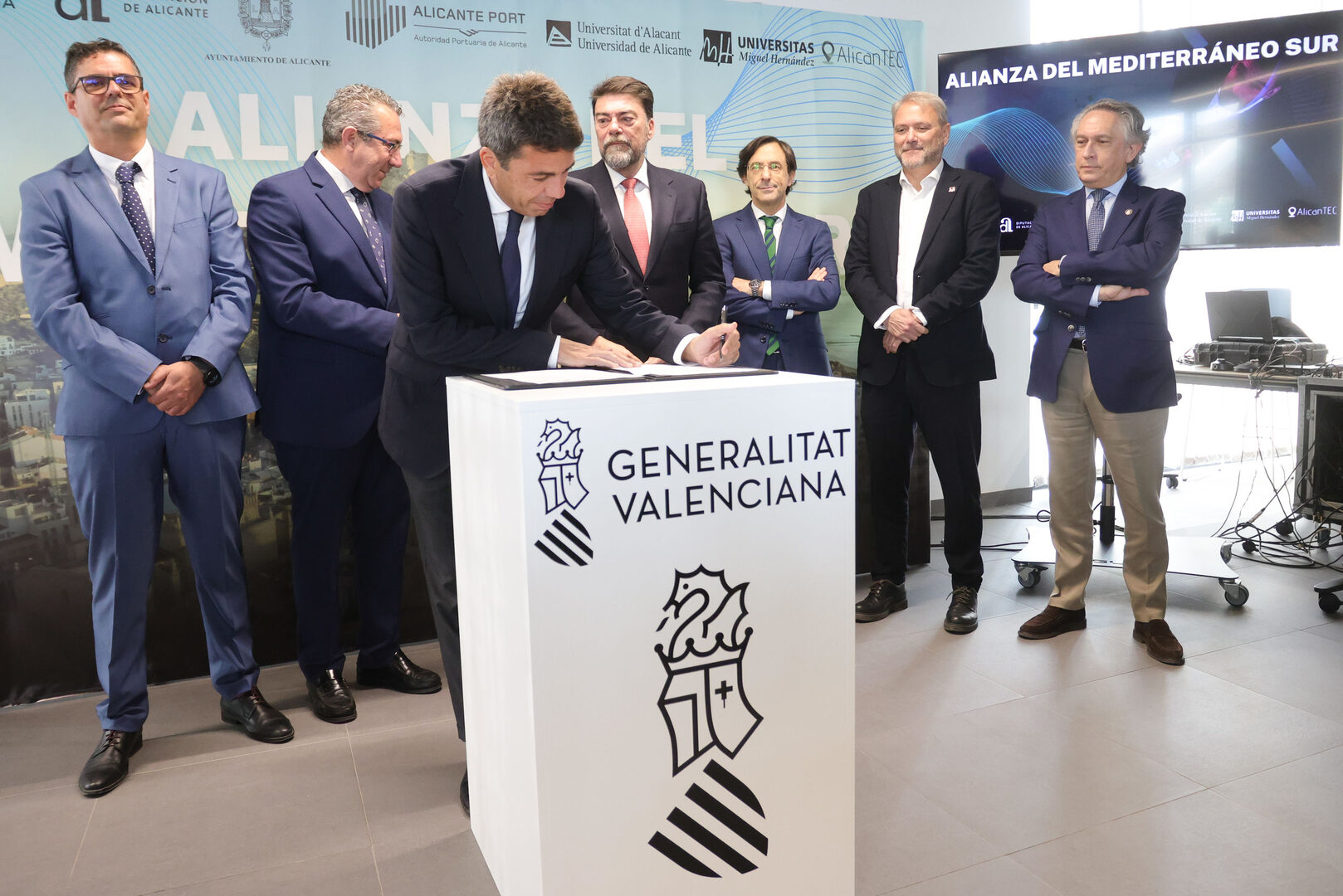 El presidente de la Generalidad, Carlos Mazón, ha destacado la unión estratégica entre administraciones, universidades, puerto y sector tecnológico para impulsar el Mediterráneo como polo de innovación y ha resaltado que con esta alianza "arrancamos unidos, sumando y multiplicando". Así lo ha manifestado el jefe del Consell tras la firma del protocolo entre la Universidad de Alicante, la Universidad Miguel Hernández, la Autoridad Portuaria de Alicante, la Diputación de Alicante, el Ayuntamiento de Alicante, Alicantec y la Generalidad Valenciana.