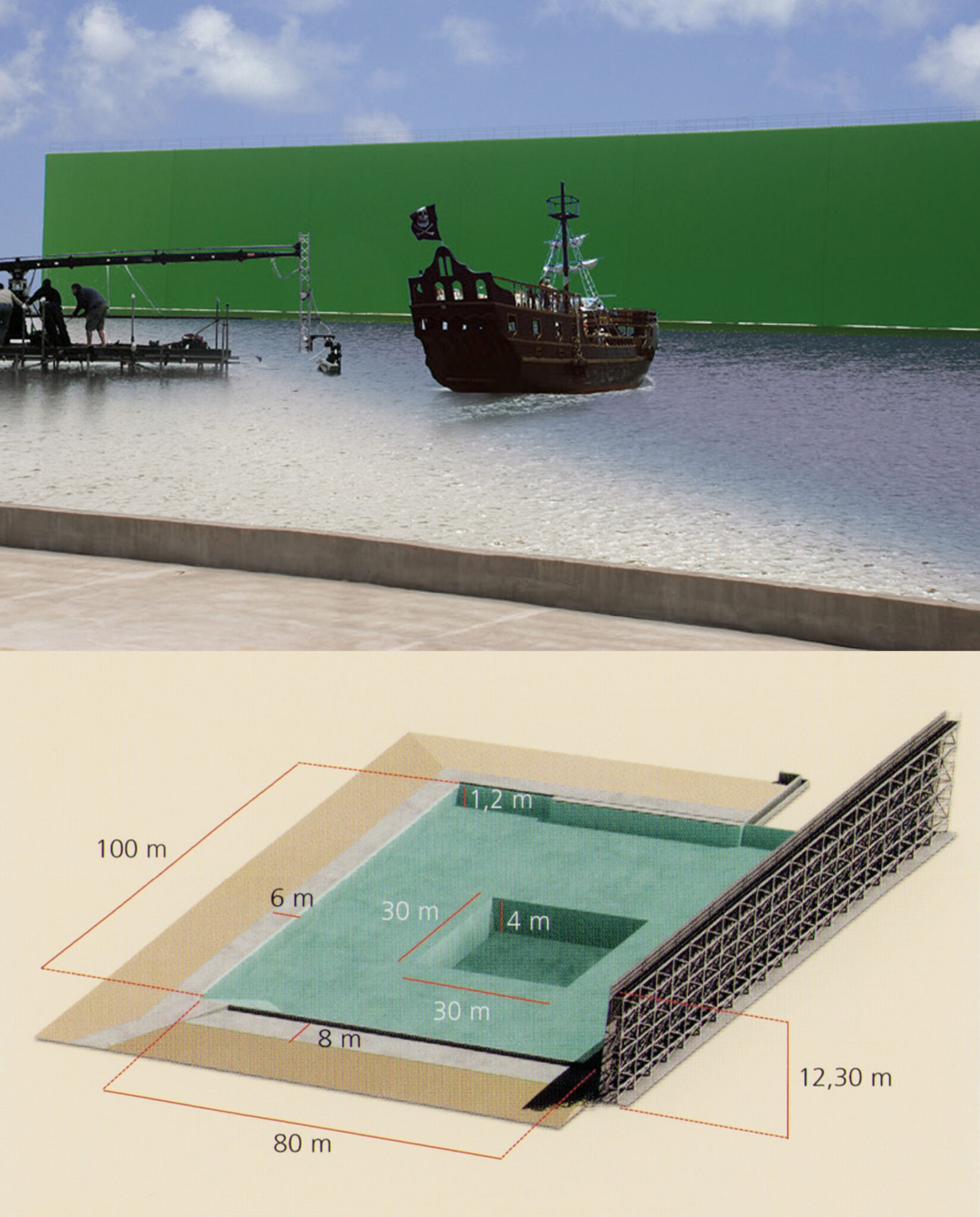 El tanque exterior de Ciudad de la Luz, el más grande de Europa, dispone de 8.000 m² con una profundidad de 1,20 metros y un foso interno de 30x30x4 metros de profundidad. La profundidad máxima alcanza los 5,20 metros en el interior. En su cara este tiene un horizonte natural y en el lado sur tiene un greenscreen de 12 metros de altura y 120 metros de longitud, así como un rebosadero y amplios espacios en sus laterales para poder construir decorados a su alrededor.