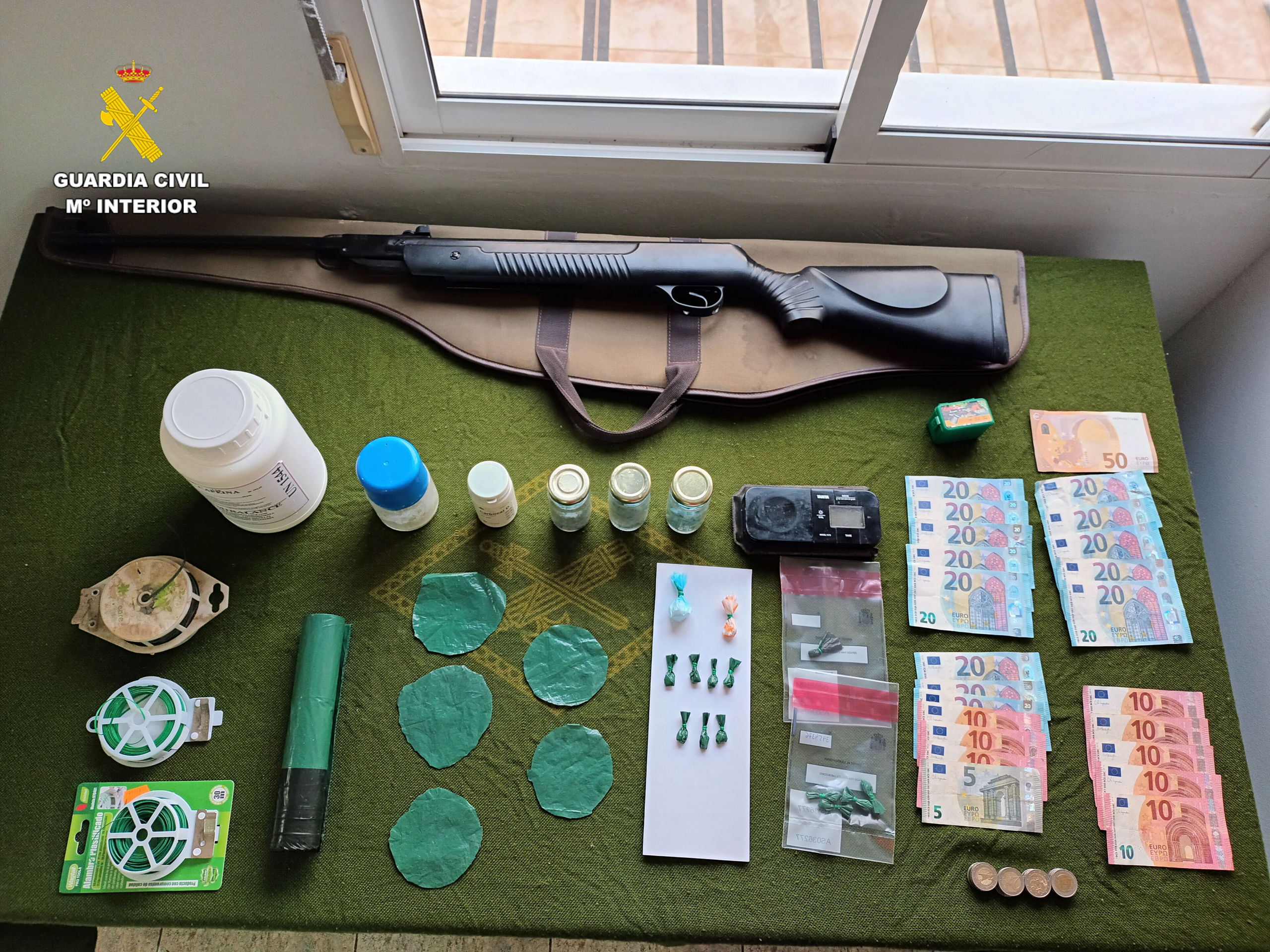 Durante el registro también se comprobó que el mismo detenido era quien preparaba las dosis y utilizaba diversas sustancias de corte para adulterar la droga. En concreto se hallaron 780 gramos de cafeína y 244 cápsulas de polvo blanco sin identificar su contenido. Entre el material intervenido, los agentes también se encontraron un arma de fuego, dinero en efectivo, y los envoltorios artesanales propios del menudeo de las sustancias en polvo.