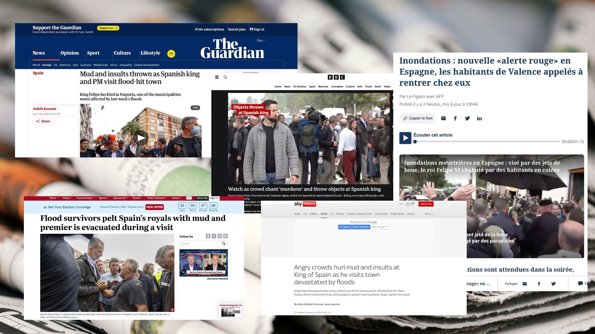 Antes de entrar de lleno en la prensa internacional, el corresponsal jefe para Europa de The Wall Street Journal, Bojan Pancevski, ofrecía una primera impresión rápida de lo sucedido a través de sus redes sociales. "El Rey de España intenta calmar a la multitud enojada en Paiporta, una ciudad de la región de Valencia afectada por las inundaciones. Se enfrenta al barro y al lanzamiento de piedras para hablar con la gente mientras el presidente Sánchez y otros políticos parecen haber sido evacuados".