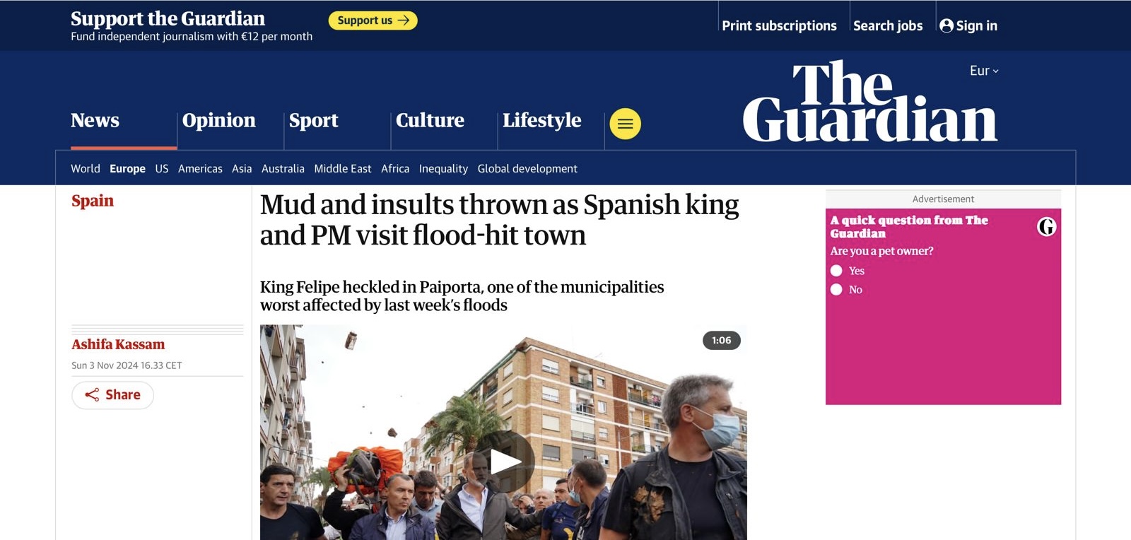 La visita de los Reyes junto al presidente del Gobierno, Pedro Sánchez, y el presidente de la Comunidad Valenciana, Carlos Mazón, a Paiporta ha generado titulares en la prensa internacional. En su llegada a uno de los municipios más afectados por la reciente DANA, las autoridades fueron recibidas con gritos de "¡asesinos!" y una lluvia de barro, palos y piedras, un reflejo de la creciente frustración de los ciudadanos.