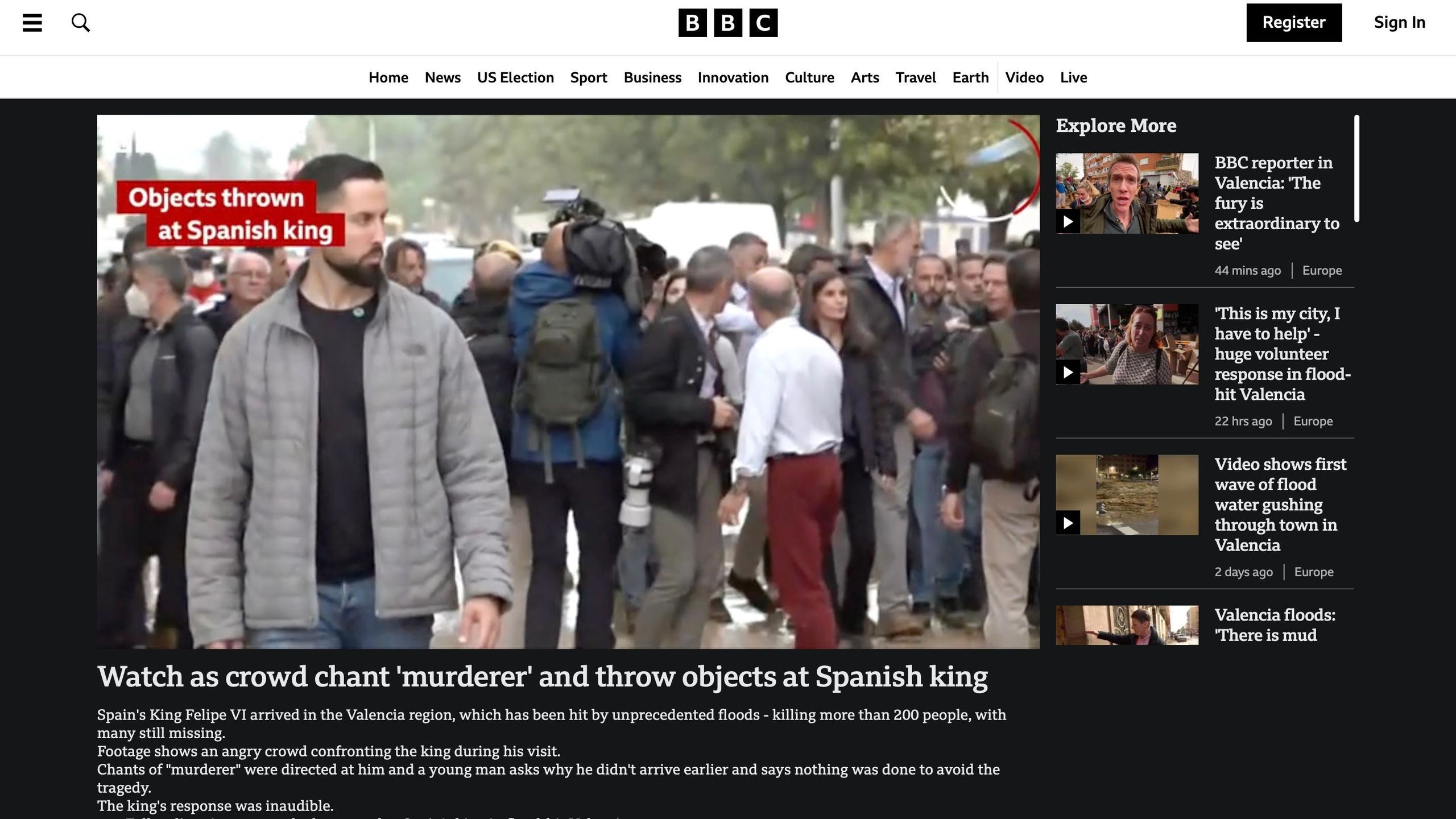 "El rey y el primer ministro españoles visitan una ciudad afectada por las inundaciones y les lanzan barro e insultos", tituló The Guardian. El diario británico añadió que el rey Felipe VI fue "abucheado en Paiporta" y que el enojo popular surge de la "sensación de abandono" en las zonas afectadas desde las lluvias sin precedentes de la semana pasada, que han dejado 213 víctimas mortales, según cifras oficiales.
