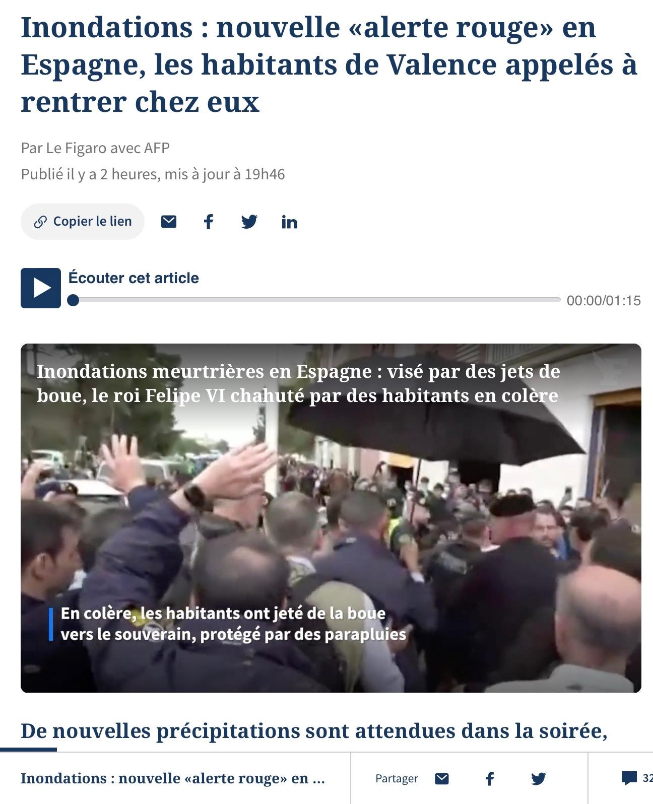 Mientras tanto, Le Figaro en su edición web ha destacado la nueva alerta roja de lluvias en la Comunidad Valenciana y ha informado sobre la suspensión de la visita de los Reyes a otras localidades: "Inundaciones en España: el rey abucheado por las víctimas enfurecidas."