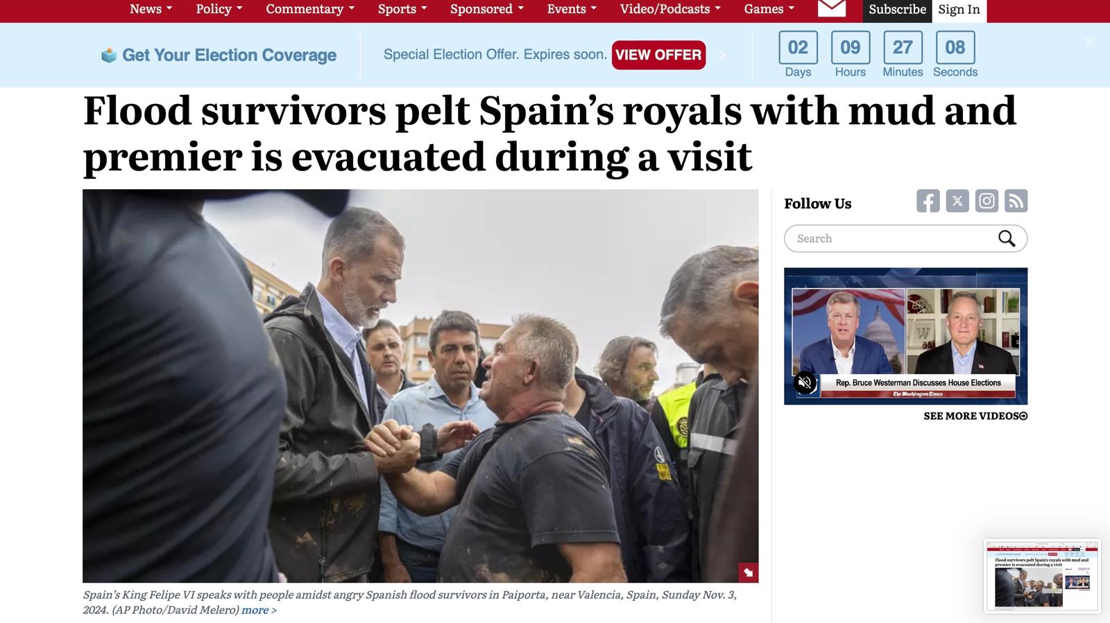 Y, el diario The Washington Times, "Supervivientes de las inundaciones lanzan barro a los Reyes de España y el presidente es evacuado durante la visita."