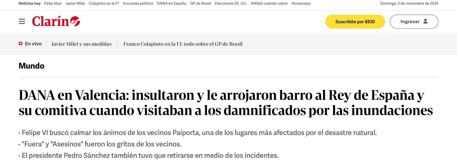 El diario argentino Clarín, titula: "La reina Letizia fue confrontada por los afectados de la DANA: '¡A ti no te falta nada!'".