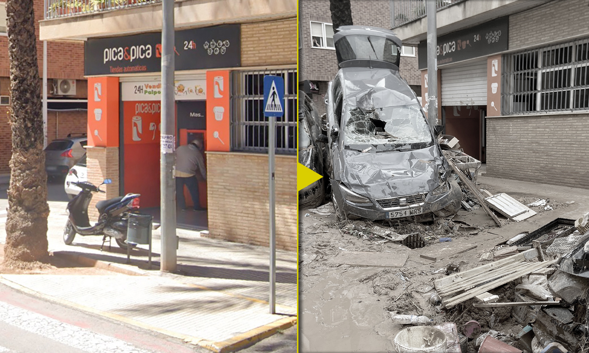 El antes y el después de una de los muchos locales afectados en Paiporta.