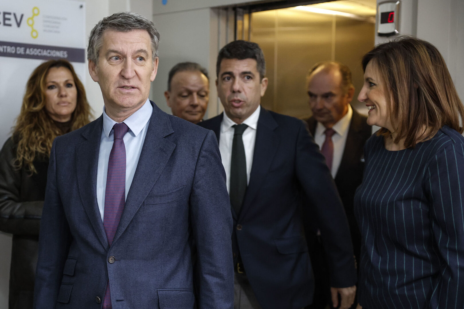 Alberto Núñez Feijóo ha visitado Valencia este lunes para participar en un acto con empresarios valencianos, al que ha acudido también el presidente regional, Carlos Mazón, además de la secretaria general del partido, Cuca Gamarra. Se trata de la tercera visita a la ciudad del presidente del PP en poco más de un mes, en una clara fiscalización del trabajo de su barón regional para evitar un mayor deterioro de su imagen y, con ello, del partido.