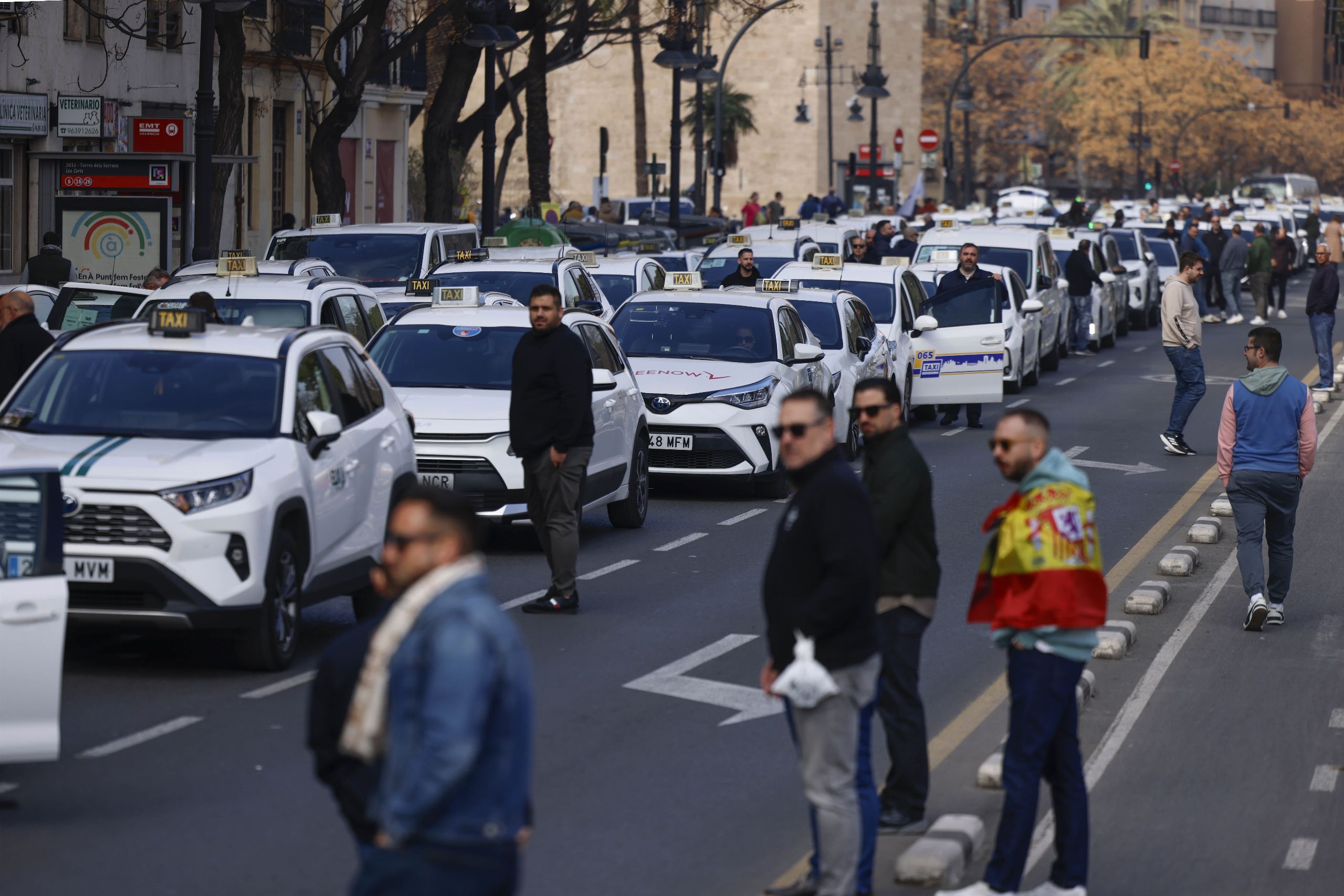 El sector del taxi ha paralizado este miércoles buena parte de la ciudad de Valencia en una jornada de huelga convocada para denunciar lo que consideran "intrusismo" por parte de las VTC y exigir a la Generalitat un decreto que garantice la supervivencia del modelo regulado.