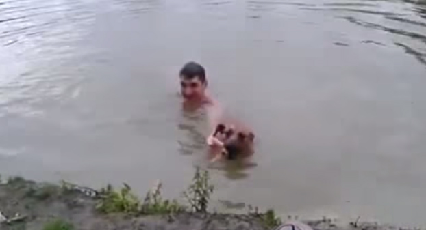 Este perro sería un buen salvavidas pues no duda ni un momento cuando ve a su dueño meterse debajo del agua y fingir que se ahoga.