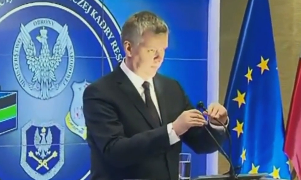 Tomasz Siemoniak, es viceprimer ministro y ministro de defensa de Polonia. En el momento de dar una conferencia se dispuso a ajustar los supuestos micrófonos y... HÁGASE LA LUZ...
