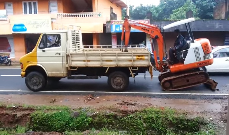 Curiosa forma que tienen en la India de subir una máquina excavadora en un pequeño camión sin utilizar una rampa.