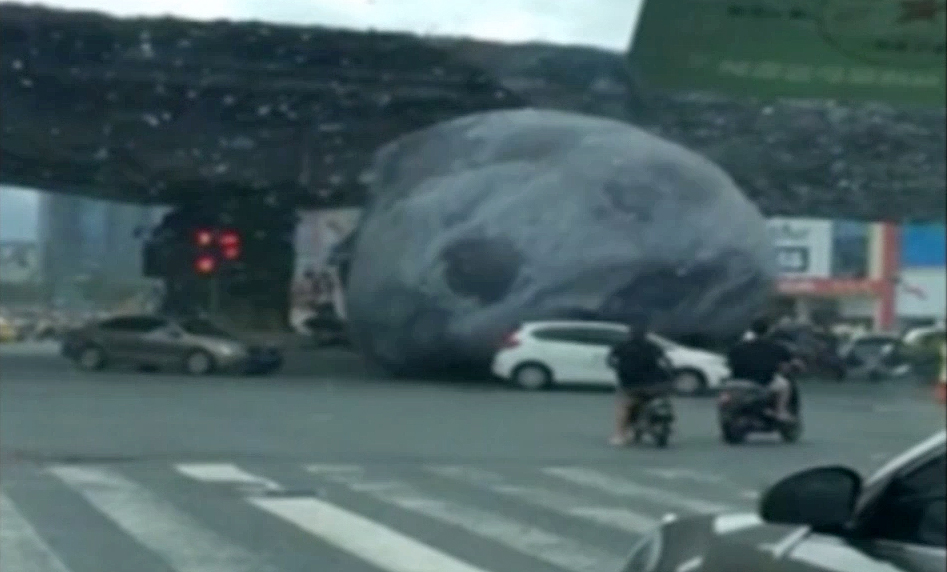 Como consecuencia del fuerte viento producido por un ciclón tropical, una maqueta esférica réplica de la Luna salió rodando de una exposición donde se mostraba, para pasearse por las calles de la ciudad china de Fuzhou.
