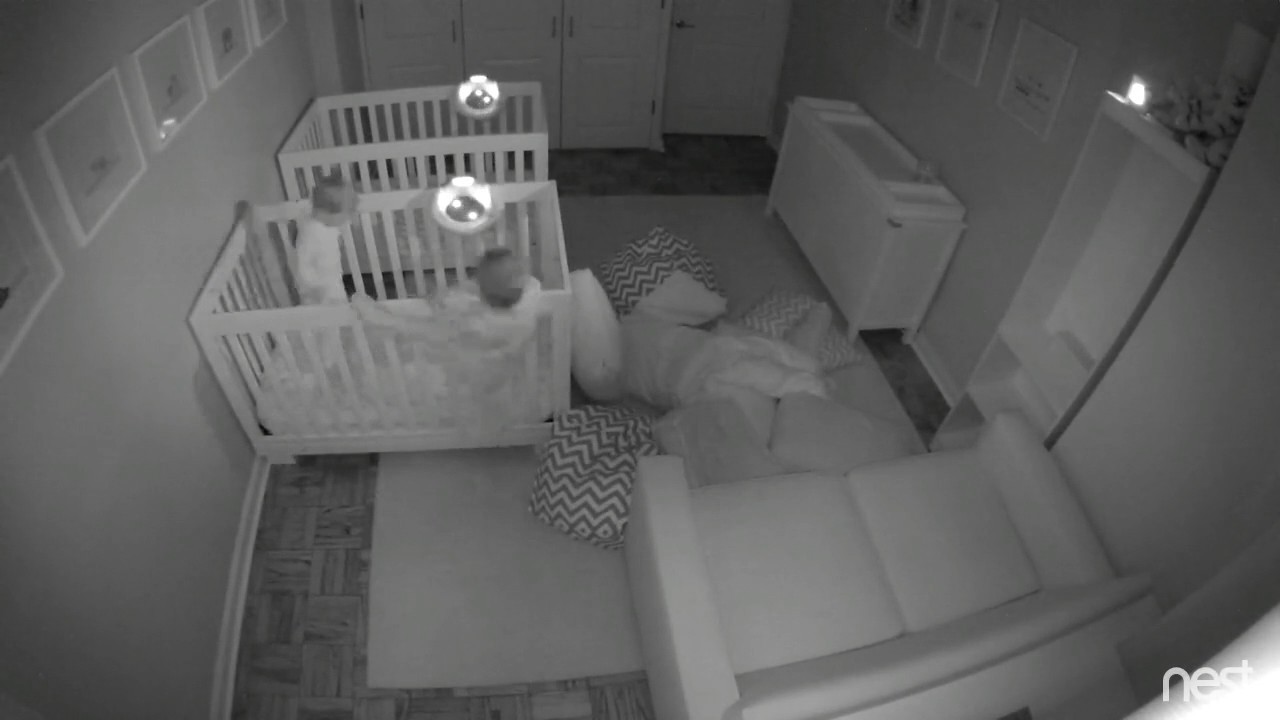 El divertido video muestra a los gemelos plácidamente tumbados en sus cunas, pero sólo unos minutos después, los niños, de dos años, se bajan, empiezan a jugar y hacer montañas con las almohadas y los cojines por todo su cuarto.