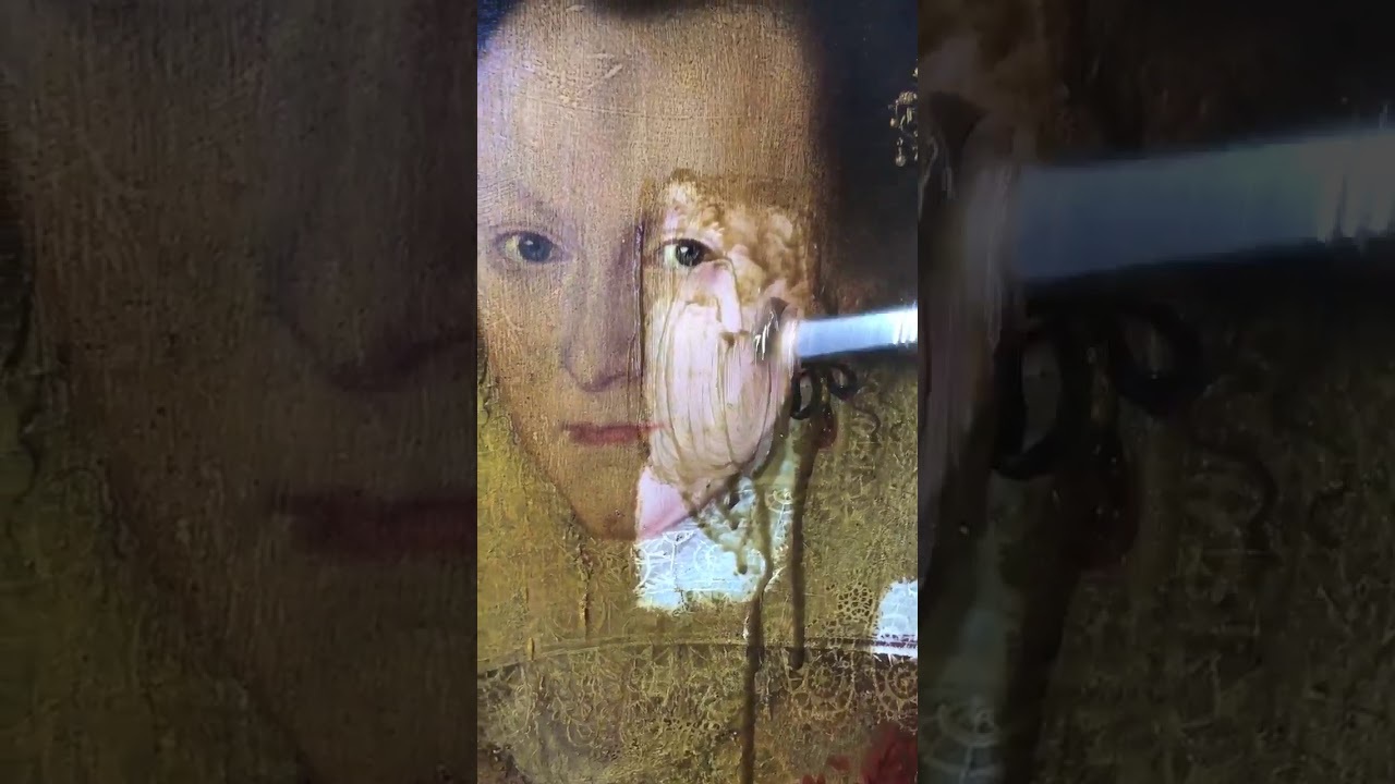 El video muestra una pintura al óleo tratada con un líquido especial. En cuestión de segundos es eliminado un barniz amarillento de 200 años, para mostrar el bello y nítido color original de la obra.
