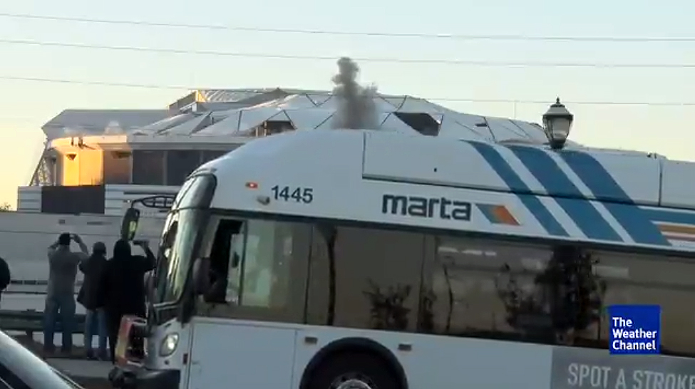El conocido canal The Weather Channel tenía todo preparado para la emisión en directo de la demolición del estadio de Georgia, en Estados Unidos. Un inoportuno autobús tapó el momento.