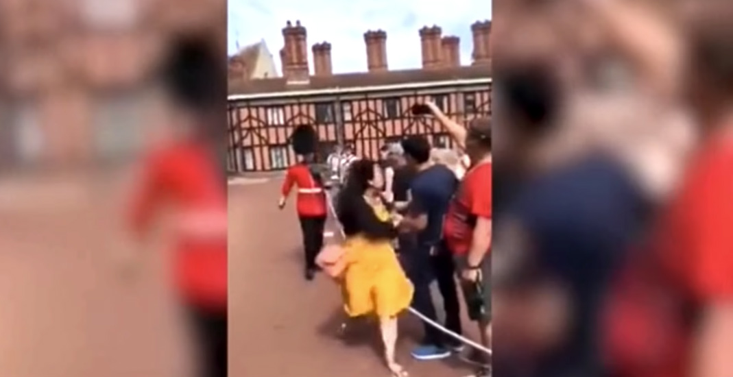 Una turista se interpone en el camino de un Guardia Real británico para hacerse una foto. El soldado no reduce su marcha y empuja a la mujer.